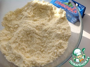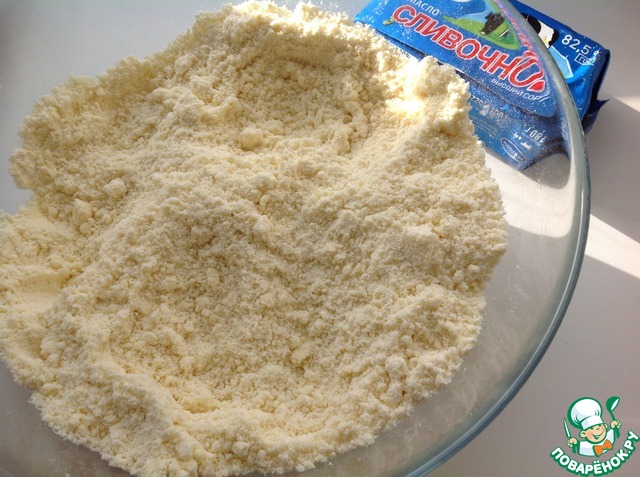Охлажденное сливочное масло нарезать кубиками, добавить к муке и растереть пальцами до состояния грубой крошки.
