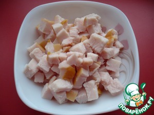 Копченую куриную грудку нарезать мелкими кусочками.