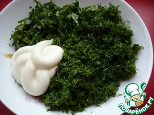 Зелень укропа и петрушки мелко нарезать и смешать с майонезом.
