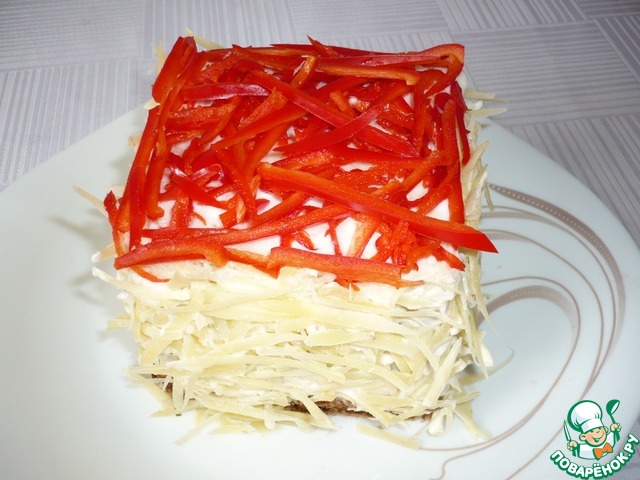 Верх торта посыпать натертым на крупной терке сладким красным перцем, а бока — натертым на средней терке твердым сыром. Приготовленный тортик поставить на 30 минут в холодильник.