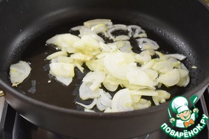 В сковороде разогреть растительное масло и обжарить порезанный мелкими полукольцами лук до прозрачности.