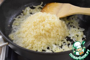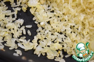 Добавить к луку промытый рис и, постоянно помешивая обжаривать до прозрачности. Я жарила на wok-комфорке 10 минут.