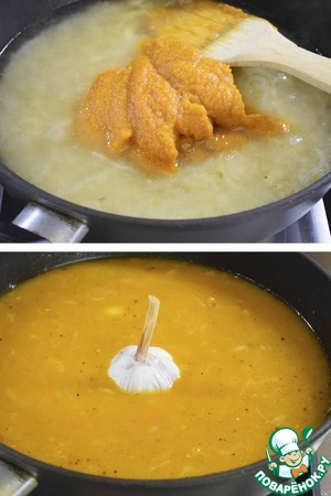 Выливаем в рис с луком воду, добавляем кабачковую икру, соль, специи (я дабавляля смесь перцев и перец-чили). Перемешиваем. В середину сковороды кладем хорошо промытую головку чеснока вместе с кожурой.