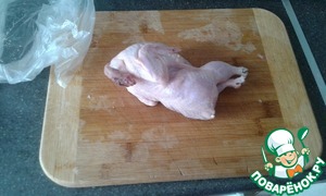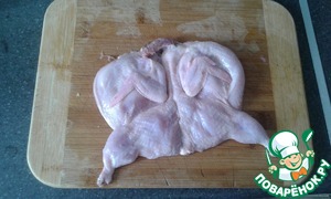 Разрезаем по грудке нашу птичку и разложив сие чудо на доске, накрываем мешочком и старательно отбиваем ее, дабы размягчить немного, но стараемся не повредить целостность.