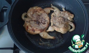 Теперь в жаровню наливаем масла растительного немного и обжариваем по паре минут на каждой стороне. А пока обжаривается, лук чистим и режем на 4 части каждую.