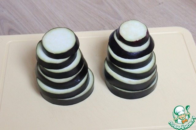 Выкладываю на тарелку кружочек баклажана, обильно смазываю его начинкой, затем выкладываю следующий кружочек.