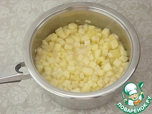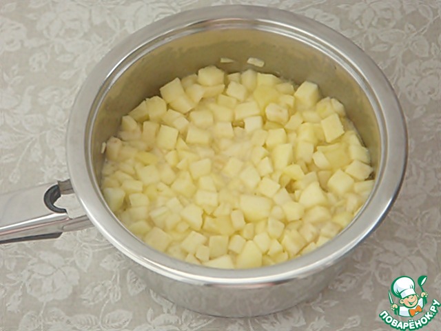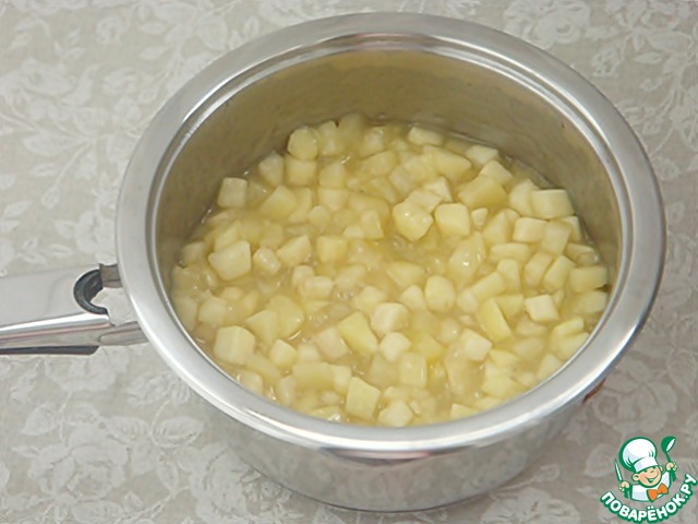 Добавить нарезанные кубиками предварительно очищенные яблоки, 45 мл воды и 80 г сахарного песка.