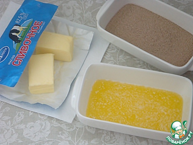 В одну емкость вылить 70 г растопленного сливочного масла, в другую насыпать смесь из 120 г сахарного песка и корицы.
