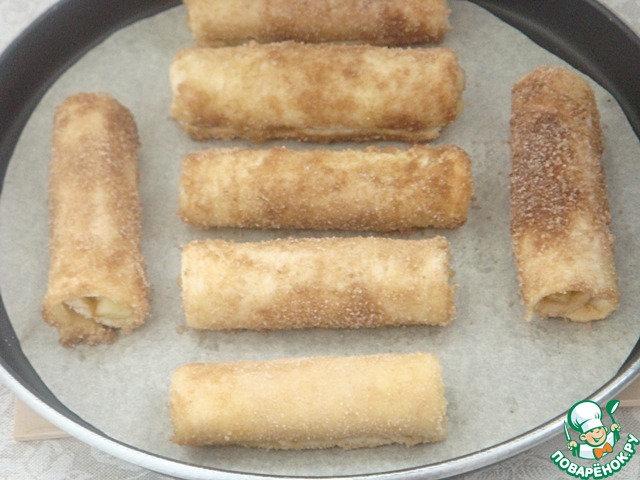 Окунуть каждый рулет в растопленное сливочное масло, затем обвалять в сахарно-коричной смеси и выложить в форму, застеленную бумагой для выпечки.