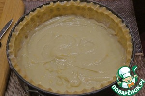 • Форму d 22-23 см смазать сливочным маслом, присыпать мукой и отправить в холод на 30 минут. Песочное тесто достать из холодильника. Распределить его по форме руками, оформив высокие бортики (начинки у нас достаточно). Затем выложить половину заварного крема.