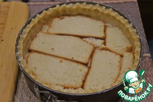 • Бисквит нарезать ломтиками и плотно выложить по всей поверхности крема. Сверху на бисквит выложить и разровнять оставшийся крем.
