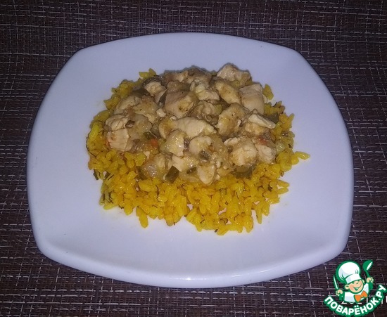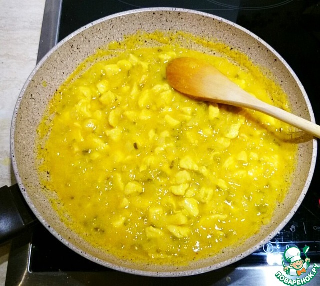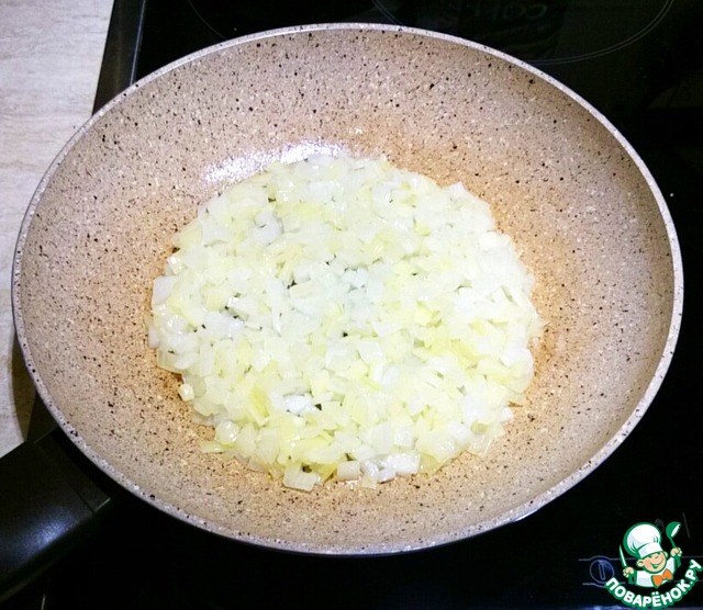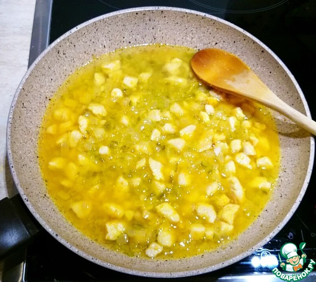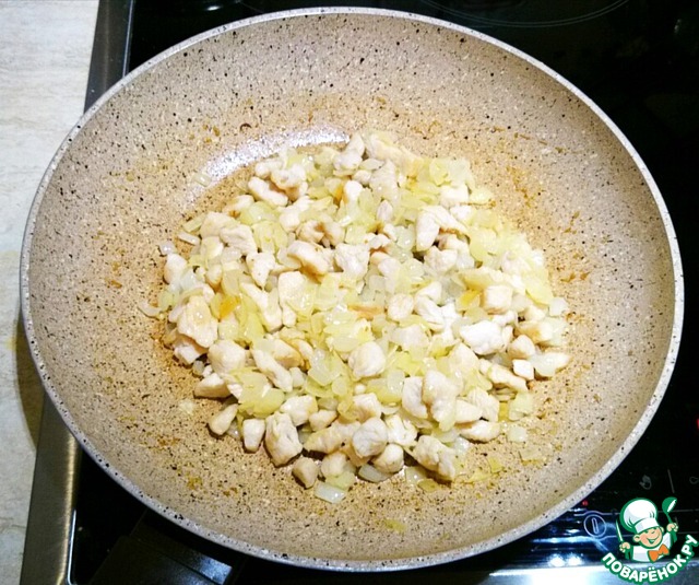 Добавляем к луку порезанное мелкими кубиками куриное филе, обжариваем его до готовности.