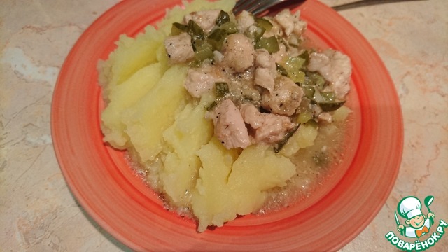 Кусочки куриного филе, обжаренные с луком и маринованными огурчиками в нежном соусе! Не передать словами, насколько это вкусно именно с отварным картофелем! И подавать нужно непременно с зеленым луком и черным хлебушком! Вы будете на седьмом небе!