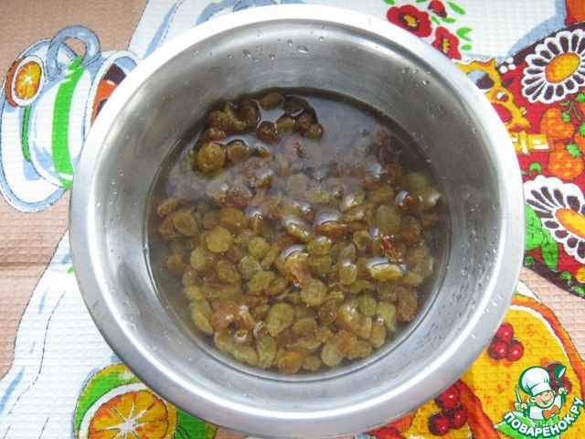 • Сначала подготовим изюм, его надо замочит в горячей воде и оставить на 30 минут.