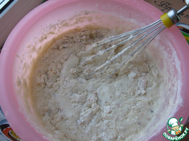 • Теперь кладём изюм и орехи, добавляем муку с манкой, быстро замешиваем тесто.