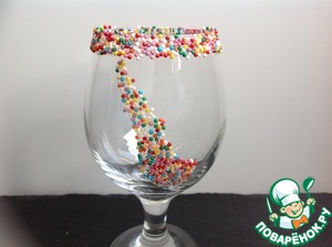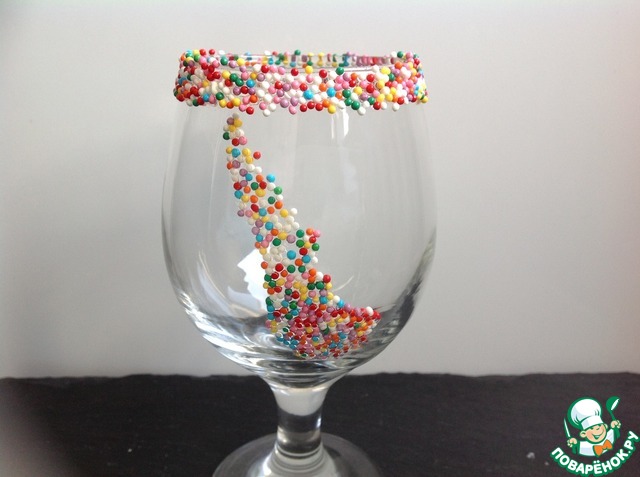 Слегка смазать внутри стеклянного бокала стенку и ободок небольшим количеством меда с помощью обычной кисточкой для рисования. Посыпать кондитерской декоративной посыпкой. -