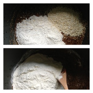 Всыпать хлопья и ржаную муку. Перемешать.
