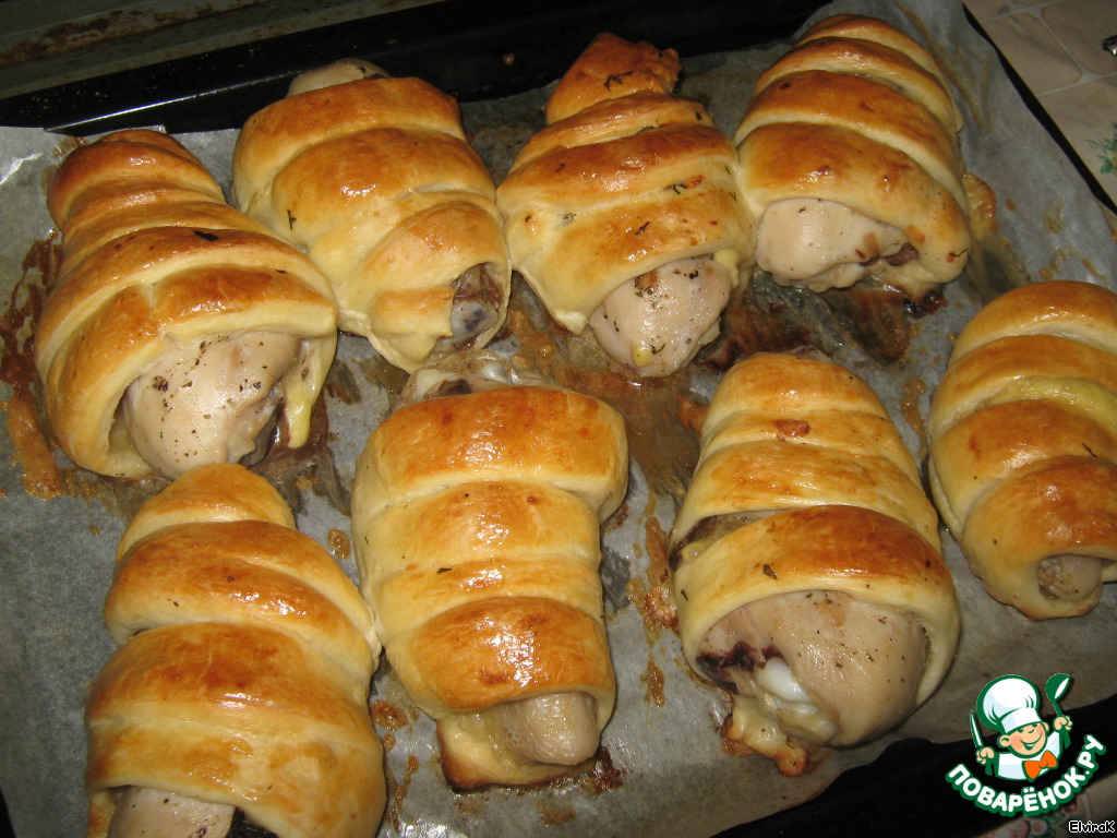 Обмотать каждую голень полосками теста, начиная с косточки.