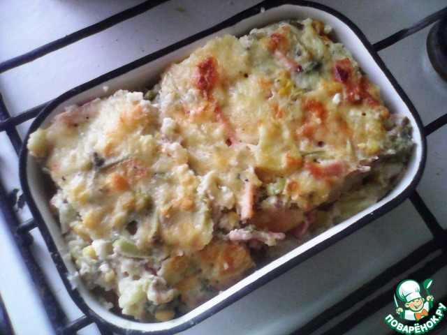 В большой миске смешать нарезанный картофель, брокколи, ветчину, кукурузу и половину твердого сыра.