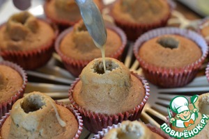 Наполним капкейки карамелью. Приблизительно по полной чайной ложке в каждое отверстие. Не страшно, если и мимо карамель прольется..