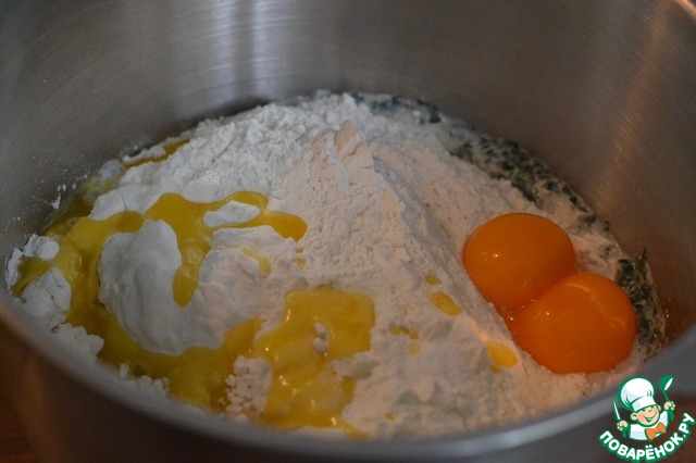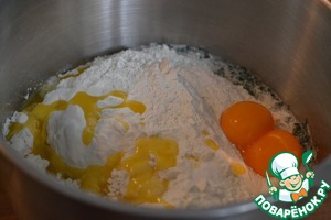 Добавить всю муку, растопленное и охлажденное масло, желтки, соль. Замесить тесто, используя крюк для замеса теста. -