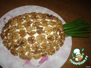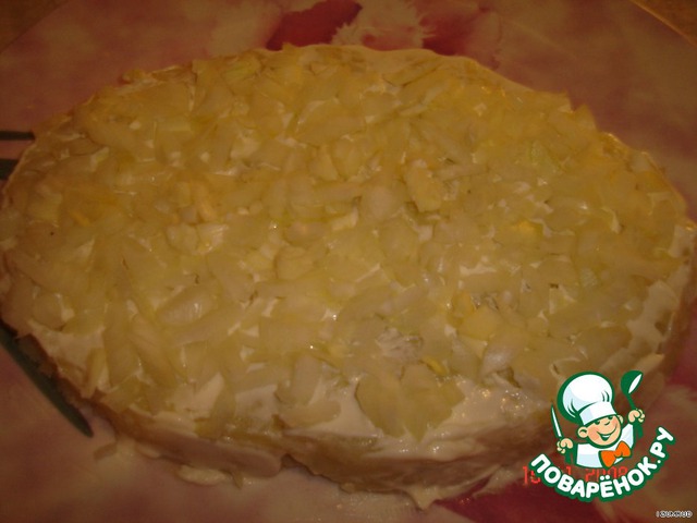 8 слой - плотно друг к другу выкладываем орехи и из лука формируем стебель ананаса.