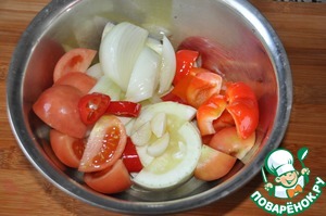 Берём цуккини, помидоры, болгарский перец, лук, чеснок, жгучий красный перец и режем произвольно достаточно крупными кусками. Сбрызгиваем растительным маслом, перемешиваем.