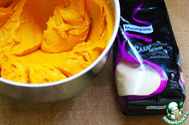 Тыкву испечь до мягкости, охладить, мякоть смолоть в блендере, отцедить влагу, если мякоть водянистая.