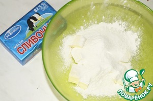 Теперь нужно подготовить кракелюр. Для этого в чаше соединяем сливочное масло, порезанное кубиками, муку и сахар.