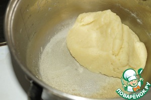 Для заварного теста: в кастрюлю вливаем молоко и воду, добавляем соль, сахар и порезанное на кусочки сливочное масло. Ставим кастрюльку на плиту и нагреваем, доводим до кипения (к этому времени масло должно раствориться). Всыпаем сразу всю муку и быстро работая лопаткой перемешиваем, формирую ком из теста. Прогреваем тесто на огне еще пару минут, помешивая его. Снимаем с огня и даем остыть до комнатной температуры.