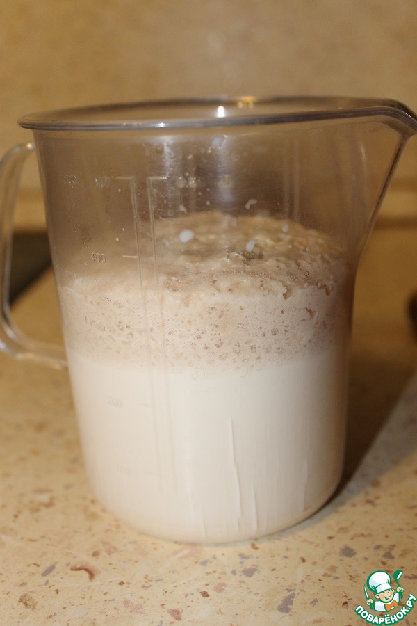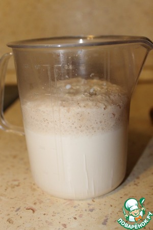 Смешать все ингредиенты для опары, накрыть полотенцем и поставить в теплое место на 20 минут.