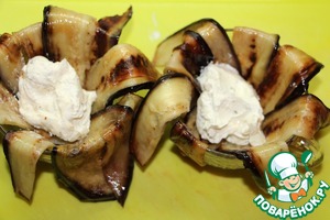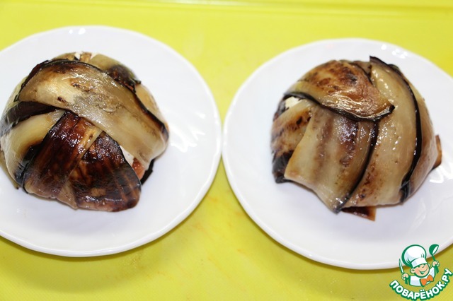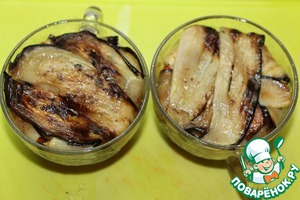 В чайные чашки (маленькие креманки) выложить внахлест ломтики баклажан, так, чтобы концы свисали.