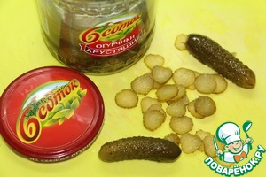 - Огурец маринованный (огурчики хрустящие "6 соток", возможно понадобится больше или меньше огурчиков.) — 7 шт