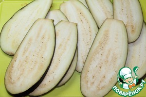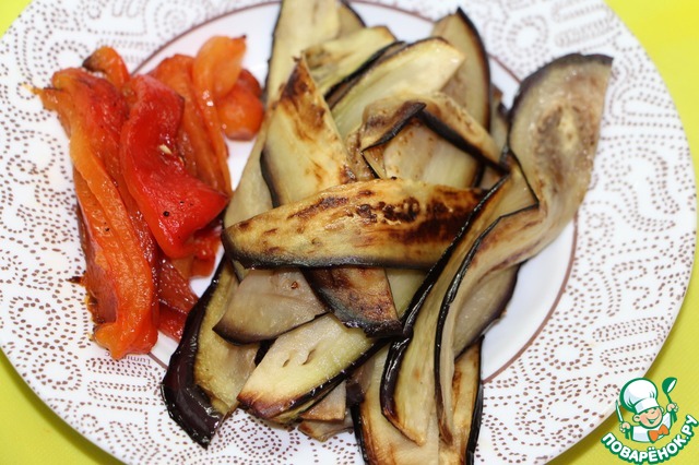 Ломтики баклажан обжарить на растительном масле, затем выложить на бумажное полотенце для впитывания лишнего масла.