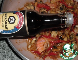 Помешиваем и добавляем соевый соус. Соус натурального брожения ТМ KIKKOMAN достаточно соленый, его вполне хватит на суп, с учетом соленых лимонов. Рекомендую ориентироваться на ваш вкус. Перемешать содержимое тщательно, дать выпарится лишней жидкости.