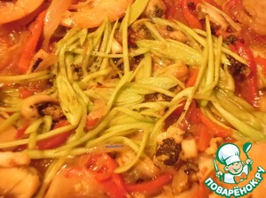 К подрумянившимся овощам добавить морской коктейль ( мидии, креветки, кальмаров и осминожков порезать мелкими кусочками). Обжарим, помешивая, на сильном огне 5-7 минут, добавить лимон.