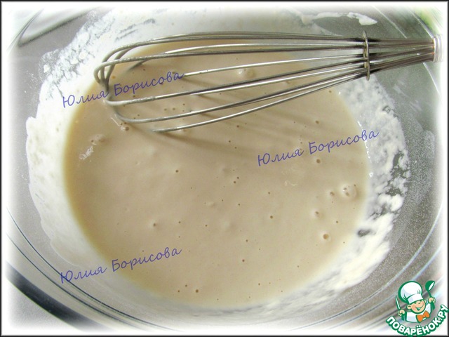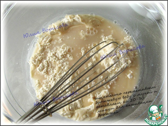 Развести 125 гр. муки (взяв от общего количества) с тёплой водой и дрожжами и оставить на 20-30 минут для активации дрожжей.