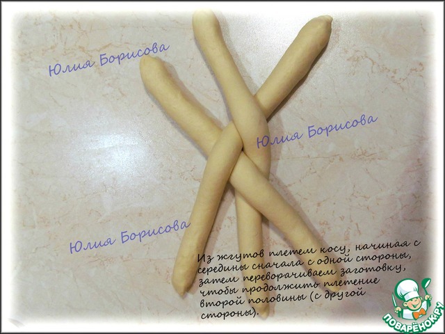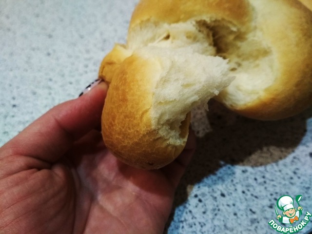 [+5]Форма была чуть больше, поэтому хала получилась пониже. Внутрь жгутиков добавила жареный лук, а масла влила только 20 граммов. И дрожжей надо чуть больше.
