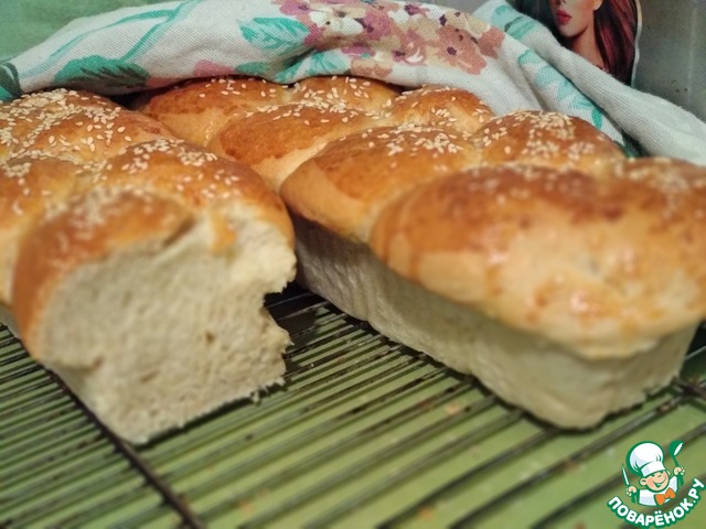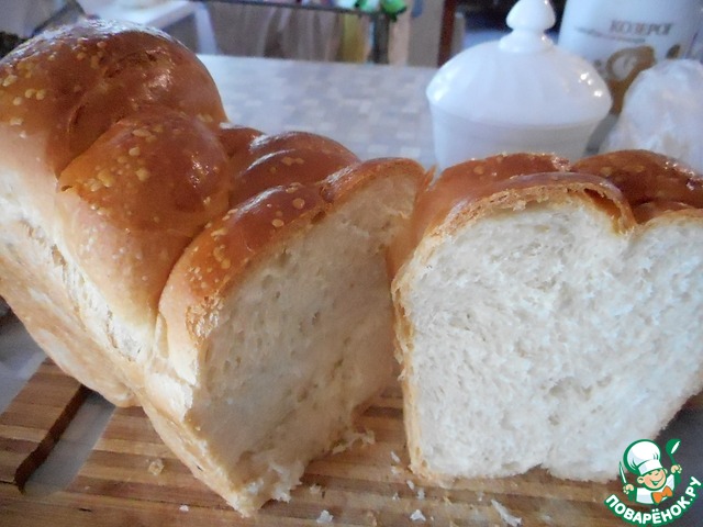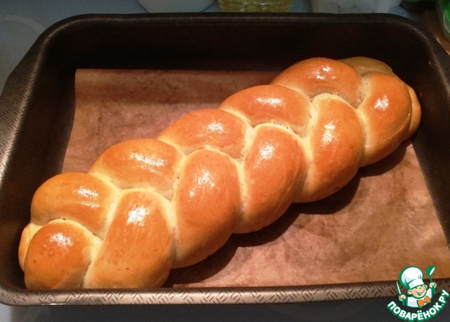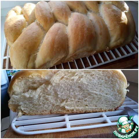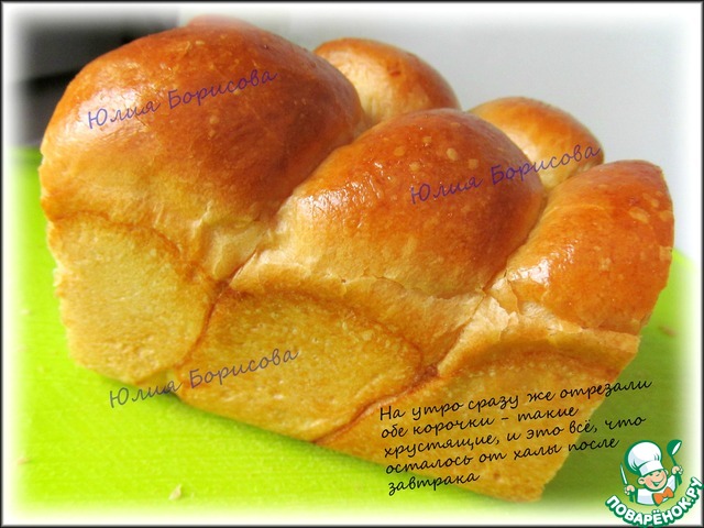 Этот прекрасный хлебушек я нашла на другом кулинарном сайте (say7), у автора Маркизко (а она, по её словам нашла рецепт в журнале ЖЖ), за что ей огромное спасибо. Слова автора копирую, ибо лучше описать не смогу)) Прелесть этой халы в том, какая она белоснежная, какая легкая, какая хлебная. Белее и воздушнее не бывает. В ней настолько мало сдобы, что её можно было бы назвать "халой бедняка": в тесто идет всего лишь ложечка сахара и вообще не добавляется яиц, а яйцом для смазки можно смазать дюжину, если не больше, литовских хал. Литовскую халу лишь слегка смазывают яйцом перед выпечкой и никогда ничем не посыпают и не вмешивают в неё изюм. По этой причине её корочка никогда не бывает темно-малиновой, а только золотистой. Литовская хала почти всегда печется в хлебных формах, опять же из экономии места и топлива, чтобы в духовку можно было всунуть побольше хал. Если же литовскую халу пекут на противне, на поду или в виде булочек, то печку сильно раскочегаривают, чтоб получить тонкую хрустящую корку. Это редкий вид халы, который не обгорит в сильном жару, а красиво заколеруется в темно-золотистый цвет.