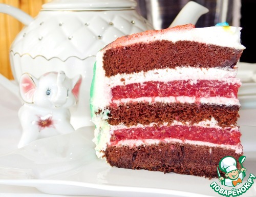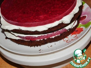 Смазываем первый бисквит немного кремом, затем кладем малиновый слой, еще немного крема и второй бисквит.