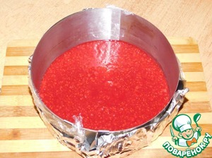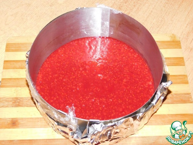 Малиновую массу разливам на 2 формы D=18-20 см. Дно форм необходимо сделать герметичным. И, лучше всего, малиновую массу сначала остудить и подождать, когда немного загустеет, чтобы она не вытекла. Затем формы с малиной убираем в морозилку.