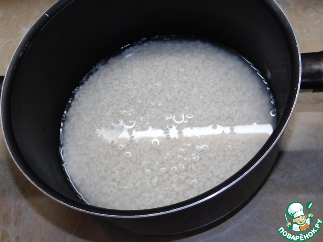Рис для суши необходимо хорошо промыть, залить холодной водой на 30 минут и оставить постоять. Затем воду слить.