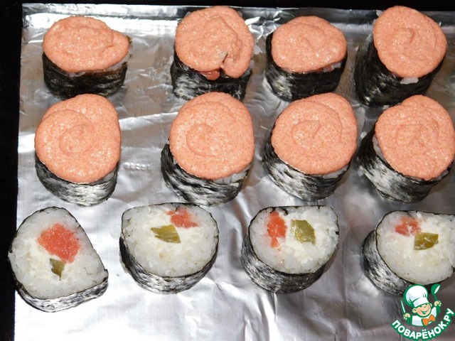 Нарезаем роллы на несколько частей, сверху выкладываем немного икорно-рыбной массы (продается в небольших баночках, в рыбных отделах) и ставим в духовку под гриль минут на 10. Никуда от плиты не уходим... гриль такая штука - чуть отвернешься и уже все подгорает.