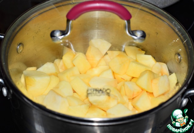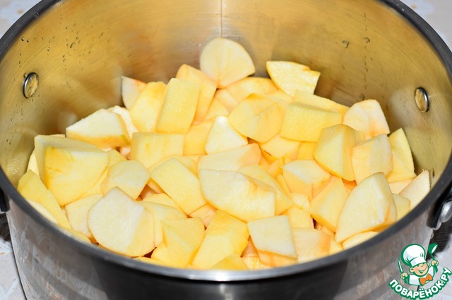 Яблоки очистить, удалить сердцевину, произвольно нарезать. Не очень крупно, но и мельчить тоже не стоит. (приведен вес уже очищенных фруктов)