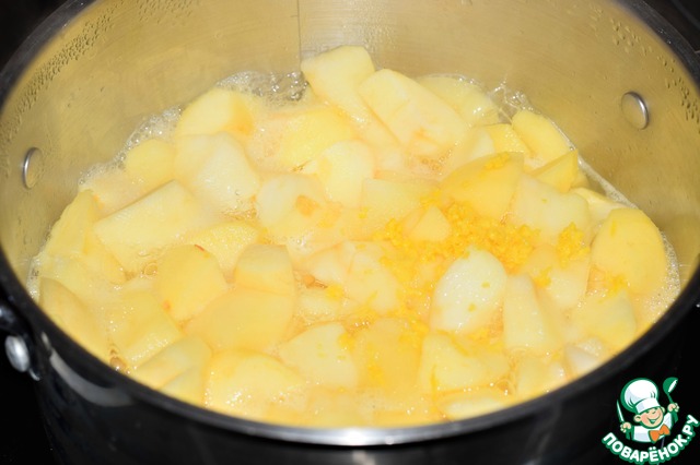 Через пять минут добавить сок и цедру половины лимона. Варить на среднем огне при закрытой крышке до полного размягчения яблок. (у меня на это уходит минут 12-15, но все зависит от сорта самих фруктов, конечно)