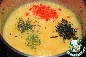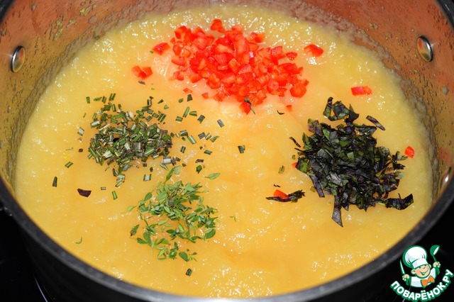 Вернуть кастрюлю на огонь, добавить перец и пряные травы, дать покипеть джему пять минут.