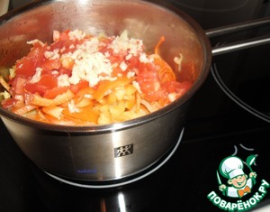 • Когда редька станет прозрачной, добавить болгарский перец, помидоры и выдавить туда же чеснок. На среднем огне потушить овощи 5 минут.