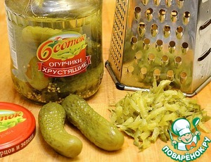 Берём маринованные огурцы, у меня ТМ 6 соток. Натираем на крупную тёрку.