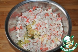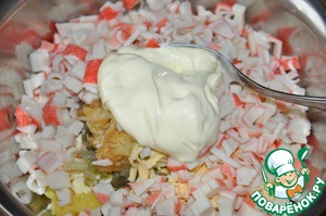 Добавляем майонез, лучше домашний, перемешиваем. Я такие салаты не солю, в них достаточно соли.