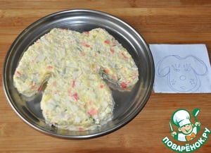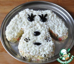 Берём большую тарелку или блюдо и выкладываем салат в форме собачьей мордочки. Рекомендую нарисовать "модель" заранее на листке и по ней "лепить" салат.